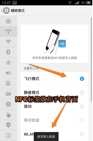 2、比如我們打開睡眠模式,將手機設(shè)置為飛行模式,如果你有其他的偏好,也可以自行修改添加。設(shè)置好之后,手機背面掃描一下NFC標(biāo)簽,就會提示“成功寫入標(biāo)簽”的字樣了。