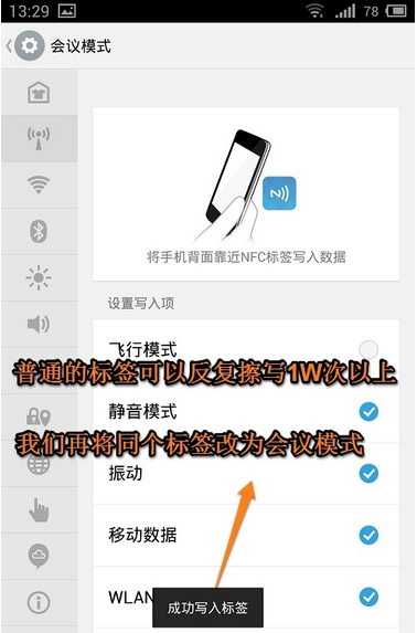 1、有時候我們需要將NFC里的數(shù)據(jù)更換或者是重新設(shè)置,這個時候怎么辦呢?其實方法很簡單的,和“寫入標(biāo)簽”的方法是一樣的,比如小編要改為“會議模式”。