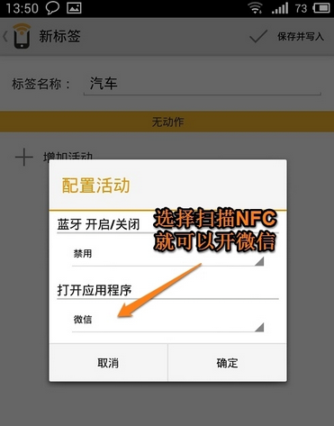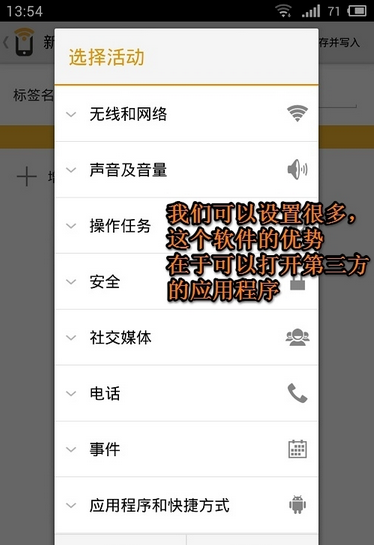 我們除了控制手機的基本功能外,我們還可以控制某些應(yīng)用程序的開啟,或者發(fā)短信給某個人,打某個人的電話。注意,魅族MX3自帶的NFC功能還無法開啟第三方應(yīng)用程序,需要其他軟件的支持。